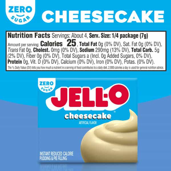 • Jell-O Zero Sugar Cheesecake Artificially Flavored Pudding Mix is a sweet treat on its own as well as a perfect ingredient for zero sugar dessert recipes