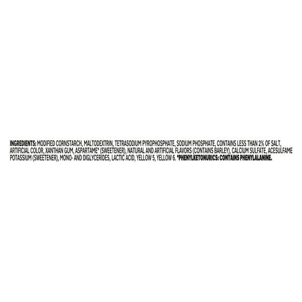 Modified Cornstarch, Maltodextrin, Tetrasodium Pyrophosphate, Sodium Phosphate, Contains Less Than 2% Of Salt, Artificial Color, Xanthan Gum, Aspartame* (sweetener), Natural And Artificial Flavors (contains Barley), Calcium Sulfate, Acesulfame Potassium (sweetener), Mono- And Diglycerides, Lactic Acid, Yellow 5, Yellow 6, *phenylketonurics: Contains Phenylalanine