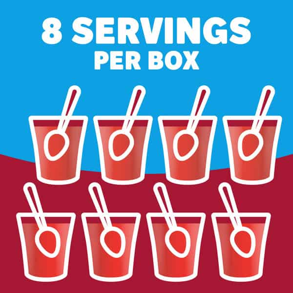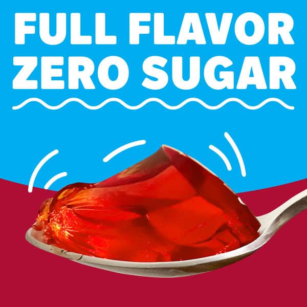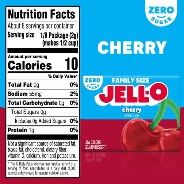 Snack happy. Jell-O Cherry Artificially Flavored Zero Sugar Low Calorie Gelatin Dessert Mix lets you add some wonder to your day with a fun snack. Spoon up a smile with our zero sugar artificially flavored cherry Jell-O gelatin that is delicious and contains 10 calories per serving. Our colorful, jiggly treat is perfect for everyday snacking or special occasions with family and friends. Additionally, our gelatin dessert mix is a versatile ingredient for creating delicious desserts like poke cakes, parfaits, pretzel salads, rainbow layer cakes and more. Our artificially flavored cherry gelatin dessert is easy to prepare. Simply add 2 cups boiling water to the gelatin mix, stir for 2 minutes until completely dissolved, stir in 2 cups cold water, then refrigerate for 4 hours or until firm. Each family size Jell-O zero sugar gelatin dessert mix is individually packaged in a 0.6-ounce sealed pouch and makes 8, 1/2-cup servings.