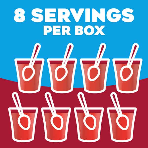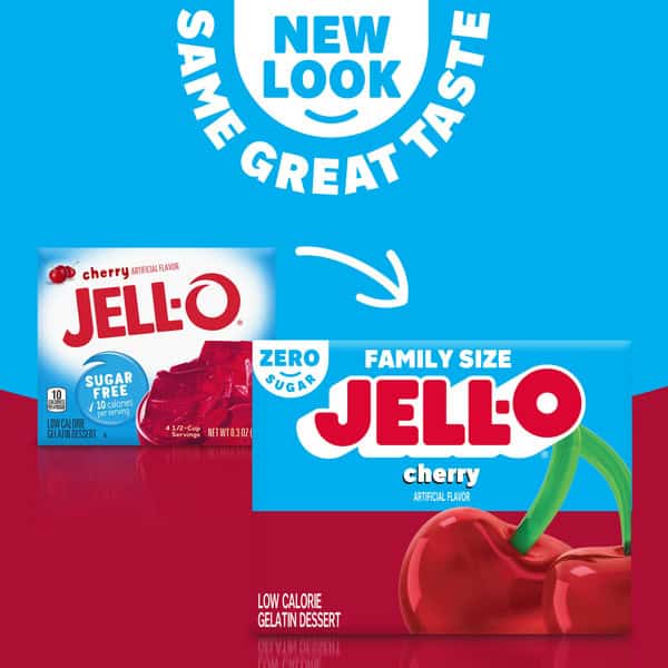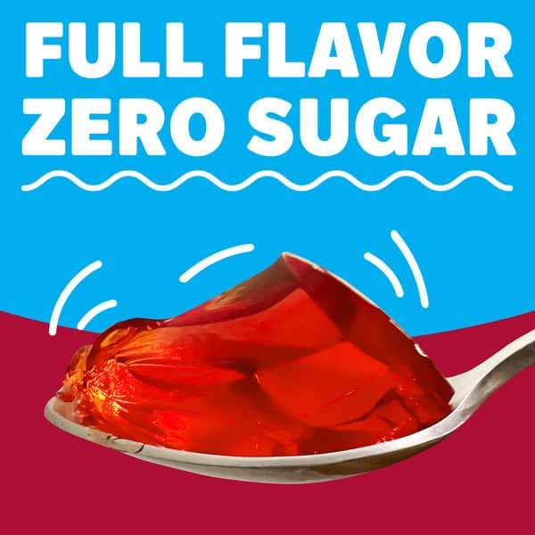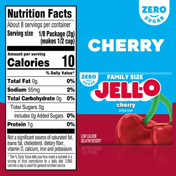 Snack happy. Jell-O Cherry Artificially Flavored Zero Sugar Low Calorie Gelatin Dessert Mix lets you add some wonder to your day with a fun snack. Spoon up a smile with our zero sugar artificially flavored cherry Jell-O gelatin that is delicious and contains 10 calories per serving. Our colorful, jiggly treat is perfect for everyday snacking or special occasions with family and friends. Additionally, our gelatin dessert mix is a versatile ingredient for creating delicious desserts like poke cakes, parfaits, pretzel salads, rainbow layer cakes and more. Our artificially flavored cherry gelatin dessert is easy to prepare. Simply add 2 cups boiling water to the gelatin mix, stir for 2 minutes until completely dissolved, stir in 2 cups cold water, then refrigerate for 4 hours or until firm. Each family size Jell-O zero sugar gelatin dessert mix is individually packaged in a 0.6-ounce sealed pouch and makes 8, 1/2-cup servings.