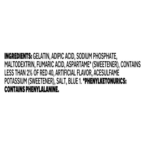 Gelatin, Adipic Acid, Sodium Phosphate, Maltodextrin, Fumaric Acid, Aspartame* (sweetener), Contains Less Than 2% Of Red 40, Artificial Flavor, Acesulfame Potassium (sweetener), Salt, Blue 1.