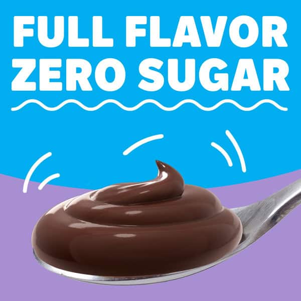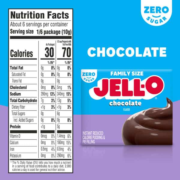 Snack happy. Jell-O Zero Sugar Chocolate Flavor Instant Reduced Calorie Pudding Mix & Pie Filling tastes delicious whether you enjoy it as a treat or use it as an ingredient in your favorite dessert recipes. Add some wonder to your day with a delicious snack. Fun to make with your kids, our zero sugar chocolate flavor pudding mix can also be used to create a poke cake, tasty crepes or chocolate pie filling. You’ll feel good about serving our zero sugar pudding mix that is 2/3 fewer calories than regular Jell-O instant chocolate pudding; as packaged, this product contains 30 calories, regular product contains 100 calories. Our zero sugar chocolate flavor pudding is ready in as little as five minutes. Simply stir milk into the pudding mix and allow to set. Every zero sugar Jell-O pudding mix comes packaged in a 2.1-ounce sealed pouch. Stock up with our convenient family-size box. Pudding fun in every bite.