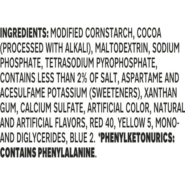 Modified Cornstarch, Cocoa (processed With Alkali), Maltodextrin, Sodium Phosphate, Tetrasodium Pyrophosphate, Contains Less Than 2% Of Salt, Aspartame And Acesulfame Potassium (sweeteners), Xanthan Gum, Calcium Sulfate, Artificial Color, Natural And Artificial Flavors, Red 40, Yellow 5, Mono- And Diglycerides, Blue 2