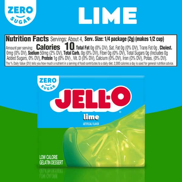 Snack happy. Jell-O Lime Artificially Flavored Zero Sugar Low Calorie Gelatin Dessert Mix lets you add some wonder to your day with a fun snack. Spoon up a smile with our zero sugar artificially flavored lime Jell-O gelatin that is delicious and contains 10 calories per serving. Our colorful, jiggly treat is perfect for everyday snacking or special occasions with family and friends. Additionally, our gelatin dessert mix is a versatile ingredient for creating delicious desserts like poke cakes, parfaits, pretzel salads, rainbow layer cakes and more. Our artificially flavored lime gelatin dessert is easy to prepare. Simply add 1 cup boiling water to the gelatin mix, stir for 2 minutes until completely dissolved, stir in 1 cup cold water, then refrigerate for 4 hours or until firm. Each Jell-O zero sugar gelatin dessert mix is individually packaged in a 0.3-ounce sealed pouch and makes 4, 1/2-cup servings.
