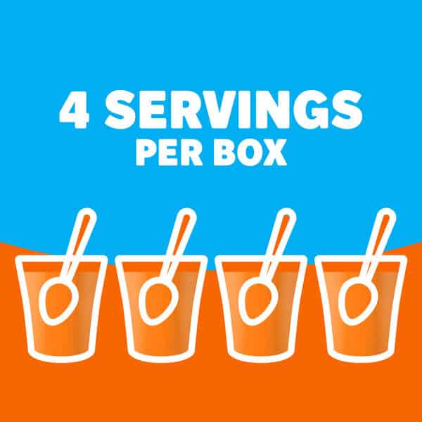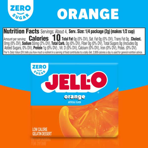 Snack happy. Jell-O Orange Artificially Flavored Zero Sugar Low Calorie Gelatin Dessert Mix lets you add some wonder to your day with a fun snack. Spoon up a smile with our zero sugar artificially flavored orange Jell-O gelatin that is delicious and contains 10 calories per serving. Our colorful, jiggly treat is perfect for everyday snacking or special occasions with family and friends. Additionally, our gelatin dessert mix is a versatile ingredient for creating delicious desserts like poke cakes, parfaits, pretzel salads, rainbow layer cakes and more. Our artificially flavored orange gelatin dessert is easy to prepare. Simply add 1 cup boiling water to the gelatin mix, stir for 2 minutes until completely dissolved, stir in 1 cup cold water, then refrigerate for 4 hours or until firm. Each Jell-O zero sugar gelatin dessert mix is individually packaged in a 0.3-ounce sealed pouch and makes 4, 1/2-cup servings.