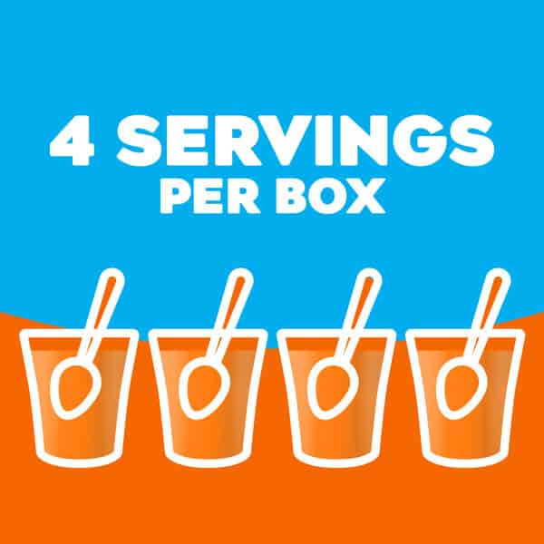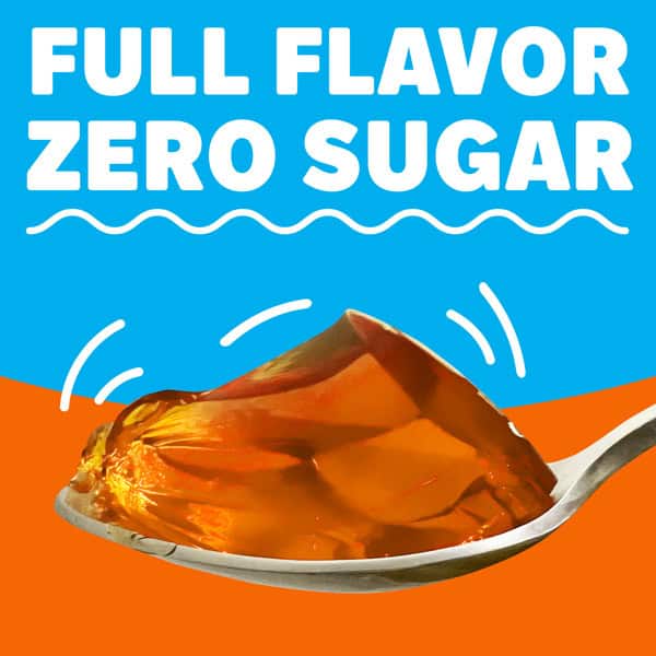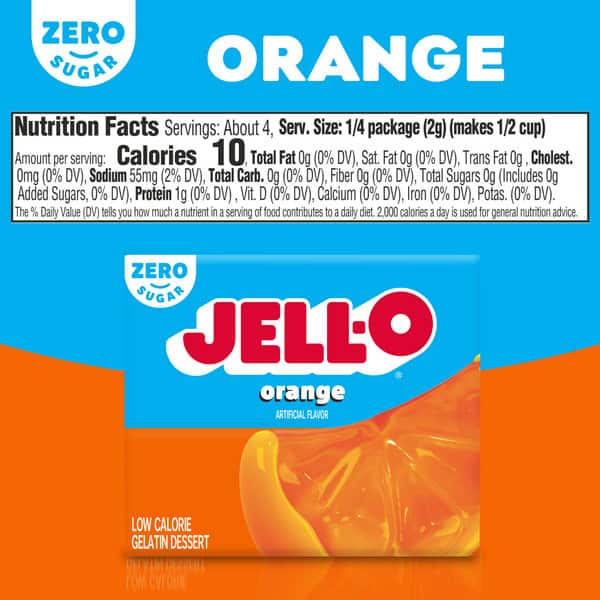 Snack happy. Jell-O Orange Artificially Flavored Zero Sugar Low Calorie Gelatin Dessert Mix lets you add some wonder to your day with a fun snack. Spoon up a smile with our zero sugar artificially flavored orange Jell-O gelatin that is delicious and contains 10 calories per serving. Our colorful, jiggly treat is perfect for everyday snacking or special occasions with family and friends. Additionally, our gelatin dessert mix is a versatile ingredient for creating delicious desserts like poke cakes, parfaits, pretzel salads, rainbow layer cakes and more. Our artificially flavored orange gelatin dessert is easy to prepare. Simply add 1 cup boiling water to the gelatin mix, stir for 2 minutes until completely dissolved, stir in 1 cup cold water, then refrigerate for 4 hours or until firm. Each Jell-O zero sugar gelatin dessert mix is individually packaged in a 0.3-ounce sealed pouch and makes 4, 1/2-cup servings.