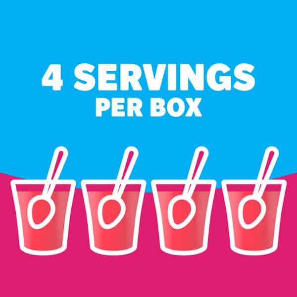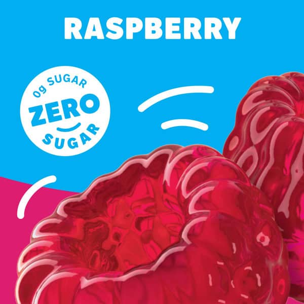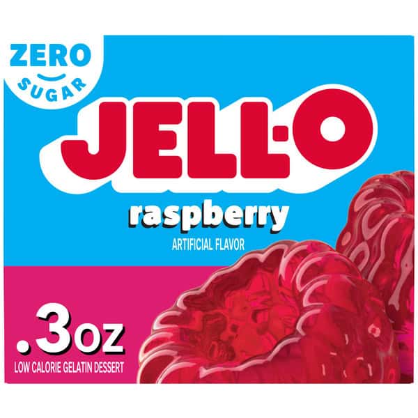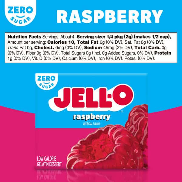 Snack happy. Jell-O Raspberry Artificially Flavored Zero Sugar Gelatin Dessert Mix lets you add some wonder to your day with a fun snack. Spoon up a smile with our zero sugar artificially flavored raspberry Jell-O gelatin that is delicious and contains 10 calories per serving. Our colorful, jiggly treat is perfect for everyday snacking or special occasions with family and friends. Additionally, our gelatin dessert mix is a versatile ingredient for creating delicious desserts like poke cakes, parfaits, pretzel salads, rainbow layer cakes and more. Our artificially flavored raspberry gelatin dessert is easy to prepare. Simply add 1 cup boiling water to the gelatin mix, stir for 2 minutes until completely dissolved, stir in 1 cup cold water, then refrigerate for 4 hours or until firm. Each Jell-O zero sugar gelatin dessert mix is individually packaged in a 0.3-ounce sealed pouch and makes 4, 1/2-cup servings.