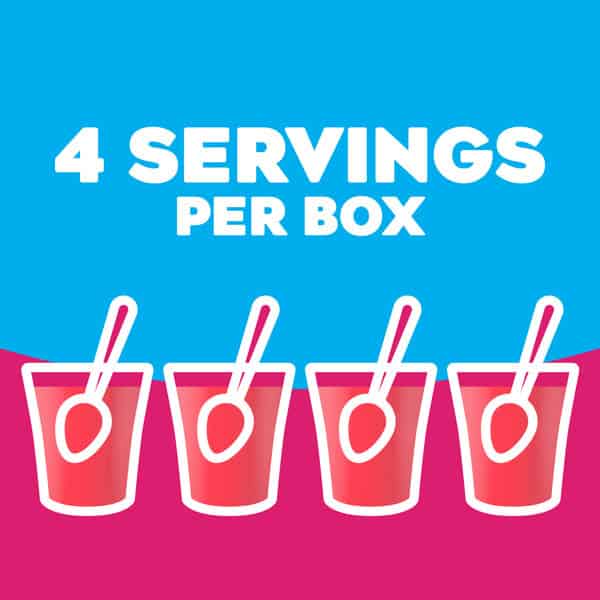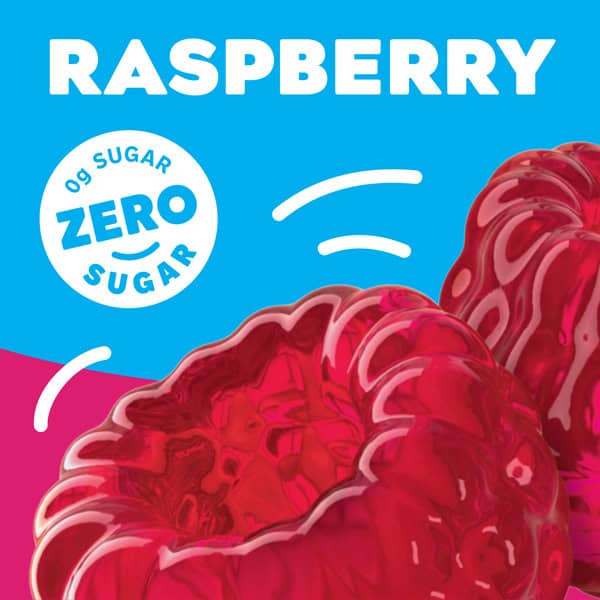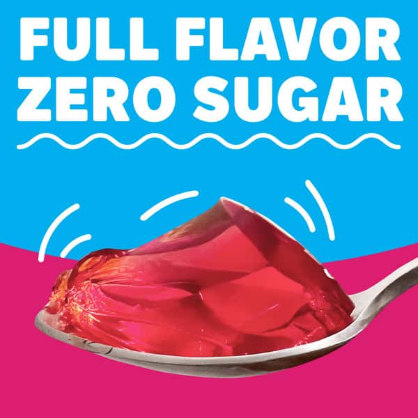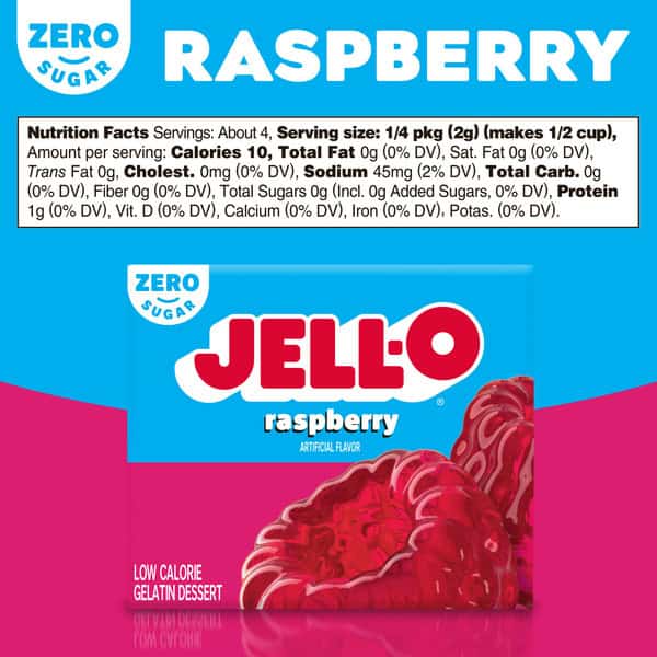 Snack happy. Jell-O Raspberry Artificially Flavored Zero Sugar Gelatin Dessert Mix lets you add some wonder to your day with a fun snack. Spoon up a smile with our zero sugar artificially flavored raspberry Jell-O gelatin that is delicious and contains 10 calories per serving. Our colorful, jiggly treat is perfect for everyday snacking or special occasions with family and friends. Additionally, our gelatin dessert mix is a versatile ingredient for creating delicious desserts like poke cakes, parfaits, pretzel salads, rainbow layer cakes and more. Our artificially flavored raspberry gelatin dessert is easy to prepare. Simply add 1 cup boiling water to the gelatin mix, stir for 2 minutes until completely dissolved, stir in 1 cup cold water, then refrigerate for 4 hours or until firm. Each Jell-O zero sugar gelatin dessert mix is individually packaged in a 0.3-ounce sealed pouch and makes 4, 1/2-cup servings.