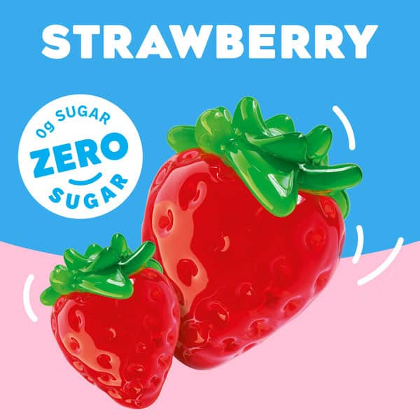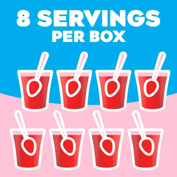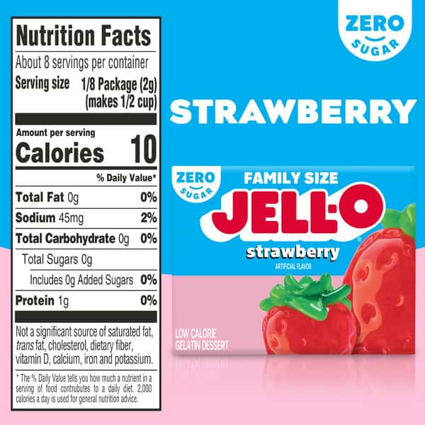 Snack happy. Jell-O Strawberry Artificially Flavored Zero Sugar Gelatin Dessert Mix lets you add some wonder to your day with a fun snack. Spoon up a smile with our zero sugar artificially flavored strawberry Jell-O gelatin that is delicious and contains 10 calories per serving. Our colorful, jiggly treat is perfect for everyday snacking or special occasions with family and friends. Additionally, our gelatin dessert mix is a versatile ingredient for creating delicious desserts like poke cakes, parfaits, pretzel salads, rainbow layer cakes and more. Our artificially flavored strawberry gelatin dessert is easy to prepare. Simply add 2 cups boiling water to the gelatin mix, stir for 2 minutes until completely dissolved, stir in 2 cups cold water, then refrigerate for 4 hours or until firm. Each family size Jell-O zero sugar gelatin dessert mix is individually packaged in a 0.6-ounce sealed pouch and makes 8, 1/2-cup servings.