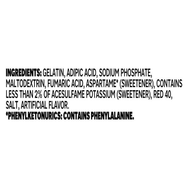 Gelatin, Adipic Acid, Sodium Phosphate, Maltodextrin, Fumaric Acid, Aspartame* (sweetener), Contains Less Than 2% Of Acesulfame Potassium (sweetener), Red 40, Salt, Artificial Flavor, *phenylketonurics: Contains Phenylalanine
