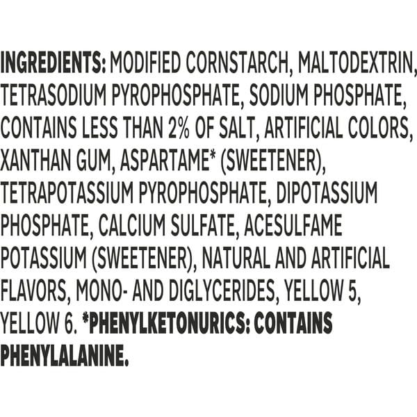 Modified Cornstarch, Maltodextrin, Tetrasodium Pyrophosphate, Sodium Phosphate, Contains Less Than 2% Of Salt, Artificial Colors, Xanthan Gum, Aspartame* (sweetener), Tetrapotassium Pyrophosphate, Dipotassium Phosphate, Calcium Sulfate, Acesulfame Potassium (sweetener), Natural And Artificial Flavors, Mono- And Diglycerides, Yellow 5, Yellow 6, *phenylketonurics: Contains Phenylalanine