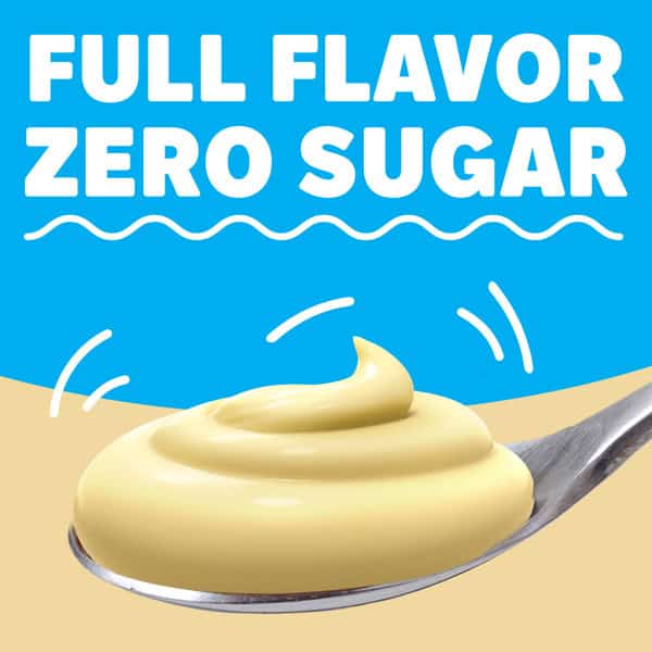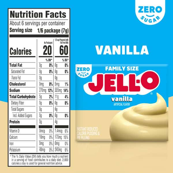 Snack happy. Jell-O Zero Sugar Vanilla Artificially Flavored Instant Reduced Calorie Pudding Mix & Pie Filling tastes delicious whether you enjoy it as a treat or use it as an ingredient in your favorite dessert recipes. Add some wonder to your day with a delicious snack. Fun to make with your kids, our zero sugar artificially flavored vanilla pudding mix can also be used to create a poke cake, tasty crepes or vanilla pie filling. You’ll feel good about serving our zero sugar pudding mix that is 2/3 fewer calories than regular Jell-O instant chocolate pudding; as packaged, this product contains 20 calories, regular product contains 100 calories. Our zero sugar artificially flavored vanilla pudding is ready in as little as five minutes. Simply stir milk into the pudding mix and allow to set. Every zero sugar pudding mix comes packaged in a 1.5-ounce sealed pouch. Stock up with our convenient family-size box. Pudding fun in every bite.