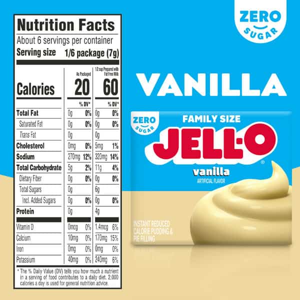 Snack happy. Jell-O Zero Sugar Vanilla Artificially Flavored Instant Reduced Calorie Pudding Mix & Pie Filling tastes delicious whether you enjoy it as a treat or use it as an ingredient in your favorite dessert recipes. Add some wonder to your day with a delicious snack. Fun to make with your kids, our zero sugar artificially flavored vanilla pudding mix can also be used to create a poke cake, tasty crepes or vanilla pie filling. You’ll feel good about serving our zero sugar pudding mix that is 2/3 fewer calories than regular Jell-O instant chocolate pudding; as packaged, this product contains 20 calories, regular product contains 100 calories. Our zero sugar artificially flavored vanilla pudding is ready in as little as five minutes. Simply stir milk into the pudding mix and allow to set. Every zero sugar pudding mix comes packaged in a 1.5-ounce sealed pouch. Stock up with our convenient family-size box. Pudding fun in every bite.