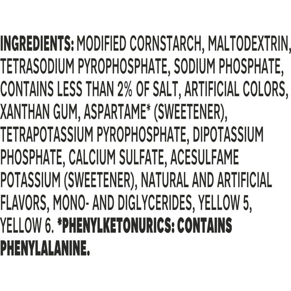 Ingredients: Modified Cornstarch, Maltodextrin, Tetrasodium Pyrophosphate, Disodium Phosphate, Contains Less Than 2% Of Salt, Mono- And Diglycerides, Natural And Artificial Flavor, Aspartamet And Acesulfame Potassium (sweeteners), Xanthan Gum, Tetrapotassium Diphosphate, Dipotassium Phosphate, Calcium Sulfate, Artificial Colors, Yellow 5, Yellow 6.