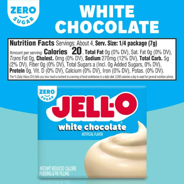 • Jell-O Zero Sugar White Chocolate Artificially Flavored Pudding Mix is a sweet treat on its own as well as a perfect ingredient for zero sugar dessert recipes