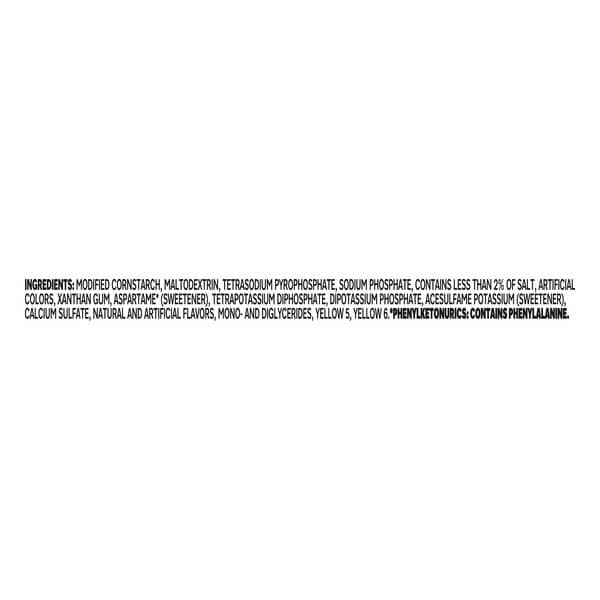 Modified Cornstarch, Maltodextrin, Tetrasodium Pyrophosphate, Sodium Phosphate, Contains Less Than 2% Of Salt, Artificial Colors, Xanthan Gum, Aspartame* (sweetener), Tetrapotassium Diphosphate, Dipotassium Phosphate, Acesulfame Potassium (sweetener), Calcium Sulfate, Natural And Artificial Flavors, Mono- And Diglycerides, Yellow 5, Yellow 6.