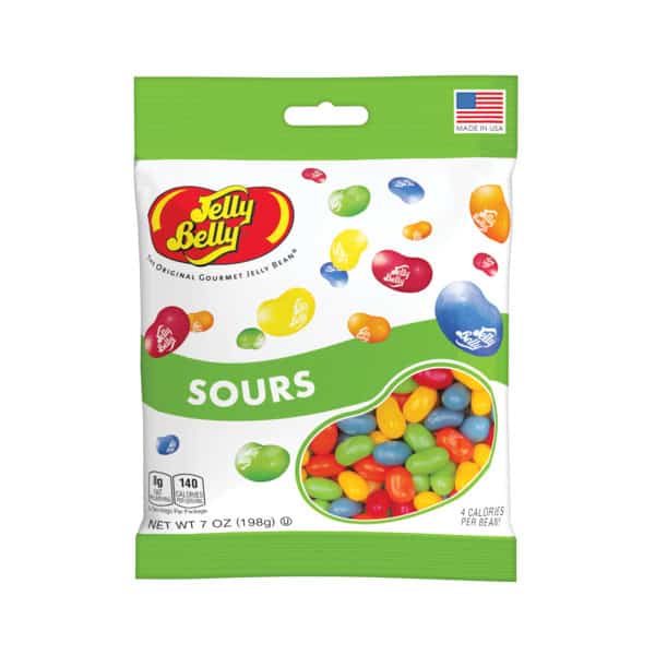 Naturally and artificially flavored. 4 calories per bean. A fat free, gluten free food. The original gourmet jelly bean. Get real. Get Jelly Belly. Sour apple. Sour Cherry. Sour grape. Sour lemon. Sour orange. Get real. Get Jelly Belly. We use real ingredients whenever possible to create our famous true-to-life flavors including: Lemon; Oranges; Apple Juice; Cherry Juice; Grape Juice. Product Guarantee: Your Jelly Belly confection items are made of the finest food ingredients. They should reach you in excellent condition. If not, we will replace them free of charge. Just return the unused portion of the package and tell us your reason for return, along with where and when you bought it. JellyBelly.com. Take our factory tour. Call 800-Jb-Beans (522-3267) or visit us at: JellyBelly.com. Made in the USA.