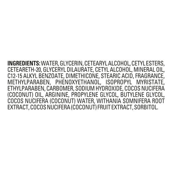 Water, Glycerin, Cetearyl Alcohol, Cetyl Esters, Ceteareth-20, Glyceryl Dilaurate, Cetyl Alcohol, Mineral Oil, C12-15 Alkyl Benzoate, Dimethicone, Stearic Acid, Fragrance, Methylparaben, Phenoxyethanol, Isopropyl Myristate, Ethylparaben, Carbomer, Sodium Hydroxide, Cocos Nucifera (coconut) Oil, Arginine, Propylene Glycol, Butylene Glycol, Cocos Nucifera (coconut) Water, Withania Somnifera Root Extract, Cocos Nucifera (coconut) Fruit Extract, Sorbitol