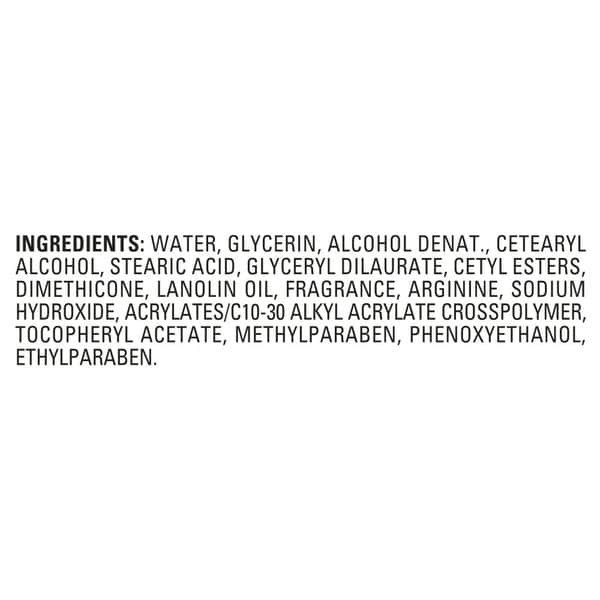 Water, Glycerin, Alcohol Denat., Cetearyl Alcohol, Stearic Acid, Glyceryl Dilaurate, Cetyl Esters, Dimethicone, Lanolin Oil, Fragrance, Arginine, Sodium Hydroxide, Acrylates/c10-30 Alkyl Acrylate Crosspolymer, Tocopheryl Acetate, Methylparaben, Phenoxyethanol, Ethylparaben