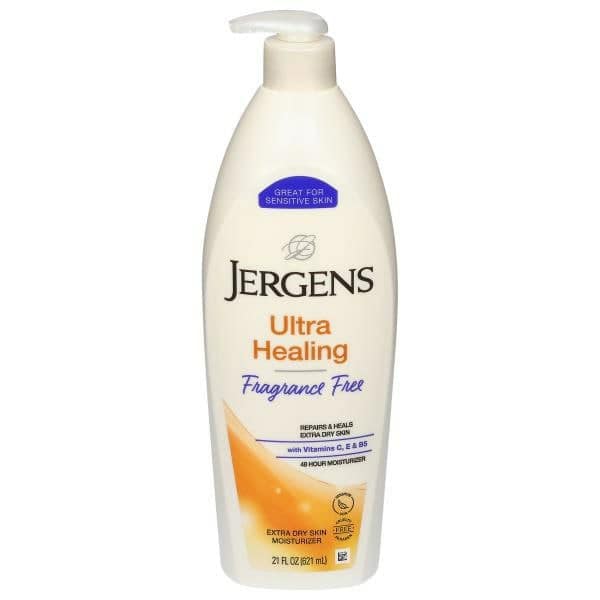 Repair dryness at the source with Jergens Ultra Healing Moisturizer for Extra Dry Skin. The nourishing formula penetrates through five layers of skin to heal extra dry skin, improve tone and texture, and leave it smooth and visibly healthier. The formula absorbs to soften areas that tend to need the most moisture like heels, elbows, and knees. This body moisturizer, with a unique HYDRALUCENCE blend of ingredients plus Vitamins C, E, and B5, leaves your skin luminous and moisturized for up to 48 hours. Satisfaction Guaranteed. Limitations may apply.
