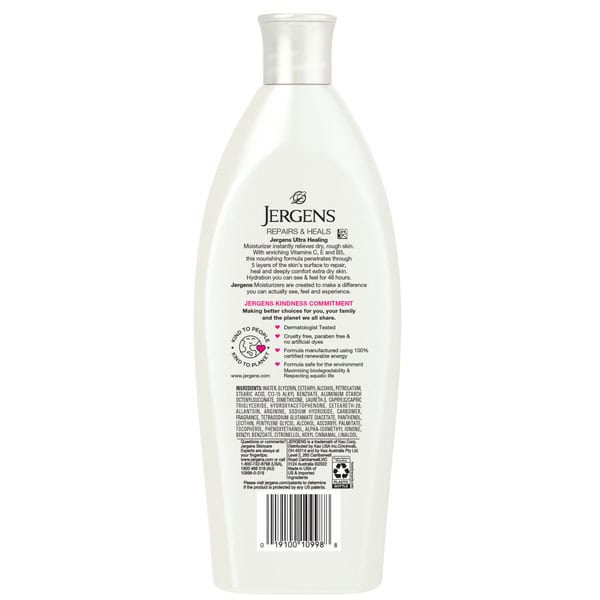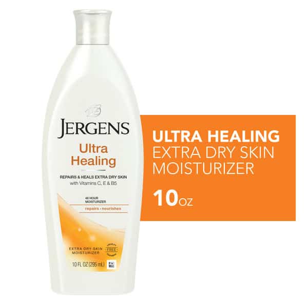Repair dryness at the source with Jergens Ultra Healing Moisturizer for Extra Dry Skin. The nourishing formula penetrates through five layers of skin to heal extra dry skin, improve tone and texture, and leave it smooth and visibly healthier. The formula absorbs to soften areas that tend to need the most moisture like heels, elbows, and knees. This body moisturizer, with a unique HYDRALUCENCE blend of ingredients plus Vitamins C, E, and B5, leaves your skin luminous and moisturized for up to 48 hours. Satisfaction Guaranteed. Limitations may apply.