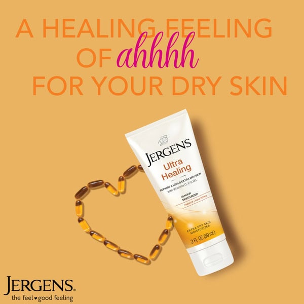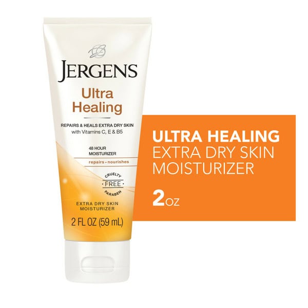 Repair dryness at the source with Jergens Ultra Healing Moisturizer for Extra Dry Skin. The nourishing formula penetrates through five layers of skin to heal extra dry skin, improve tone and texture, and leave it smooth and visibly healthier. The formula absorbs to soften areas that tend to need the most moisture like heels, elbows, and knees. This body moisturizer, with a unique HYDRALUCENCE blend of ingredients plus Vitamins C, E, and B5, leaves your skin luminous and moisturized for up to 48 hours. Satisfaction Guaranteed. Limitations may apply.
