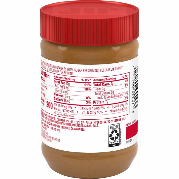 From a brand that has been trusted for generations, Simply Jif Creamy Peanut Butter gives you all of the fresh roasted peanut taste you love with 33% less total sugar than regular Jif peanut butter. One bite of our creamy peanut butter and you’ll be reminded of your very best childhood memories. Simply Jif Creamy Peanut Butter is That Jif’ing Good, making it perfect for sandwiches for an afternoon of school and practice, delicious cookies while making memories with family, and of course, delicious bites right from the spoon with this smooth-textured peanut butter. Plus, this peanut butter is low sodium, gluten free and has 7g protein (7% DV) per serving (See Nutrition Information for Fat and Saturated Fat Content). And with a jar of Simply Jif Creamy Peanut Butter Spread, you’ll always have this classic peanut butter treat on hand. Simply Jif peanut butter contains 2g total sugar per serving. Regular Jif peanut butter contains 3g total sugar per serving.