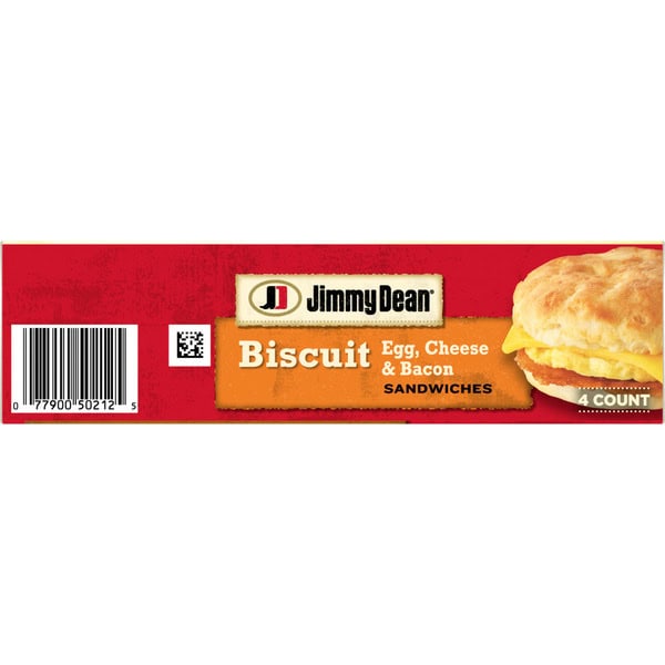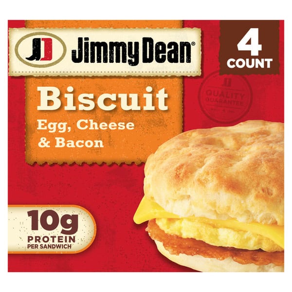 Greet the day with a warm biscuit sandwich. Featuring crispy bacon, fluffy eggs, and melty cheese on a golden baked biscuit made from scratch, Jimmy Dean Frozen Bacon, Egg and Cheese Biscuit Sandwiches make waking up in the morning the most delicious part of the day. Packed with 10 grams of protein per serving, this breakfast sandwich gives you more fuel to power your morning. Simply microwave and serve for breakfast at home or on-the-go. Includes 4 individually wrapped sandwiches. Jimmy Dean once said, Sausage is a great deal like life. You get out of it what you put in.” Which pretty much sums up his magic formula for having a great day. Today, Jimmy Dean Brand brings you many ways to add some sunshine to your morning. Because today’s your day to shine on., Rise and Shine: Start your morning off with a boost of happiness so good, you can taste it. Our golden biscuit sandwiches are made with our crispy bacon, fluffy eggs, and melty cheese that will brighten anyone’s morning., The Perfect Family Breakfast: Made with real ingredients and packed with 10 grams of protein, our sandwiches help you and the family wake up on a positive note. So, gather around the table and enjoy a warm and hearty breakfast every morning., Never Miss Breakfast Again: Ready in just minutes, our breakfast sandwiches can conveniently be placed in the microwave and quickly heated. These hearty sandwiches make for the ideal meal., Enjoy Just the Way You Want: Relish the bold taste of our breakfast sandwiches on their own, or try your favorite hot sauce to add a kick of heat to your morning! Add a side of fruit or yogurt for a sweet bite too., Signature Sausage Since 1969: Since day one, we have worked hard to produce quality food that tastes as fresh as a country morning; because we know that for a lot of folks, a good start is all you need for a great day.