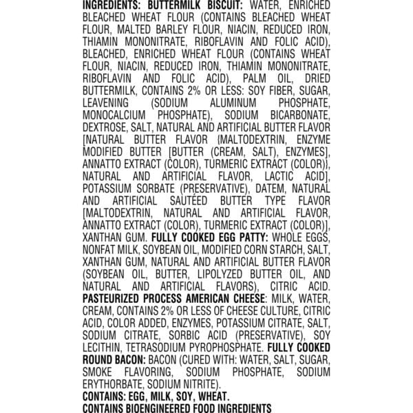 Biscuit: Enriched Bleached Flour (wheat Flour, Malted Barley Flour, Niacin, Iron, Thiamine Mononitrate, Riboflavin, Folic Acid), Water, Palm Oil, Buttermilk, Contains 2% Or Less: Isolated Soy Product, Sugar, Baking Soda, Dextrose, Salt, Acidic Sodium Aluminum Phosphate, Monocalcium Phosphate, Lactic Acid, Datem, Potassium Sorbate (preservative), Maltodextrin, Natural And Artificial Flavors, Colored With (annatto And Turmeric), Xanthan Gum, Soy Lecithin, Soy Flour. Grilled Egg Patty: Whole Eggs, Water, Soybean Oil, Nonfat Dry Milk, Modified Corn Starch, Salt, Xanthan Gum, Natural And Artificial Butter Flavor (butter [cream, Milk], Partially Hydrogenated Soybean And Cottonseed Oil, Soybean Oil, Lipolyzed Butter Oil, Natural And Artificial Flavors), Citric Acid. Pasteurized Process American Cheese: Milk, Water, Cheese Culture, Cream, Salt, Sodium Citrate, Potassium Citrate, Sodium Pyrophosphate, Sorbic Acid (preservative), Sodium Phosphate, Citric Acid, Annatto (color Added), Soy Lecithin, Enzymes. Cooked Bacon: Cured With: Water, Salt, Sugar, Smoke Flavoring, Sodium Phosphate, Sodium Erythorbate, Sodium Nitrite.
