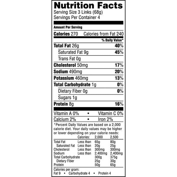 Microwave: ALWAYS FOLLOW HEATING INSTRUCTIONS. DO NOT REFRIGERATE LONGER THAN EXPIRATION DATE ON PACKAGE. MAY BE FROZEN UNTIL READY TO USE. FOR BEST RESULTS HEAT FROM REFRIGERATED. Microwave OvenInstructions were developed using an 1100-watt microwave oven. Ovens vary; heat times may need to be adjusted. 1. PREPARE:Remove 3 links from plastic pouch. Place on microwave-safe plate and cover with paper towel. 2. HEAT: FROM REFRIGERATED: Microwave on HIGH 35-40 SECONDS or until hot. FROM FROZEN: Microwave on HIGH 60-65 SECONDS or until hot. CAUTION: PRODUCT WILL BE HOT! LET STAND ONE MINUTE BEFORE EATING. ENJOY!Saute: ALWAYS FOLLOW HEATING INSTRUCTIONS. DO NOT REFRIGERATE LONGER THAN EXPIRATION DATE ON PACKAGE. MAY BE FROZEN UNTIL READY TO USE. FOR BEST RESULTS HEAT FROM REFRIGERATED. Stovetop1. PREPARE: Remove desired amount of links from plastic pouch. Place in a cold, non-stick skillet. 2. HEAT: Heat skillet to MEDIUM and cover turning links occasionally for even browning. FROM REFRIGERATED: HEAT 8-10 MINUTES or until hot. FROM FROZEN: HEAT 10-12 MINUTES or until hot. CAUTION: PRODUCT WILL BE HOT! LET STAND ONE MINUTE BEFORE EATING. ENJOY!Unspecified: None