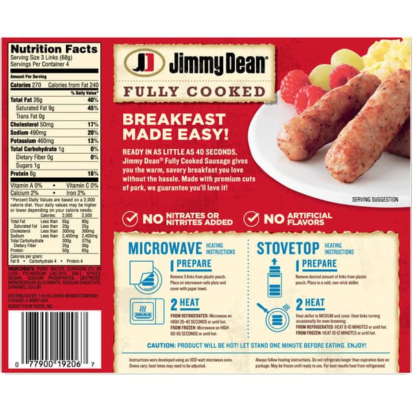 Jimmy Dean Fully Cooked Original Pork Breakfast Sausage Links are made with premium pork and seasoned to perfection with our signature blend of spices. These savory breakfast sausage links have 8 grams of protein per serving. These sausage links are simple to prepare and ready in minutes. Serve these breakfast sausages with eggs and toast for a traditional breakfast or with biscuits and gravy for brunch., One package of 12 Original Pork Breakfast Sausage Links, Fully cooked breakfast sausage made with premium pork, Seasoned to perfection with our signature blend of spices, Good source of protein – 9 grams per serving, Simply microwave and serve, Delicious addition to any meal