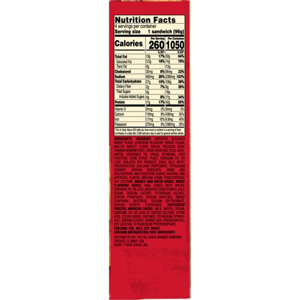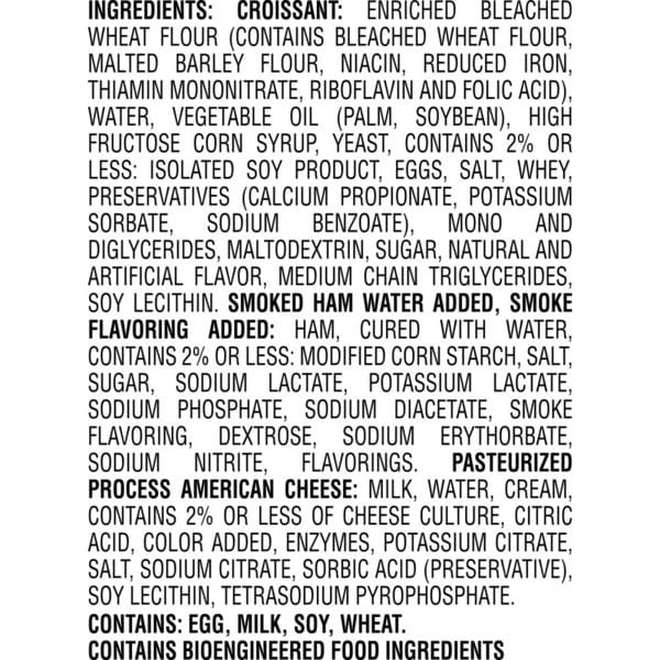 Croissant: Enriched Bleached Flour (wheat Flour, Malted Barley Flour, Niacin, Iron, Thiamin Mononitrate, Riboflavin, Folic Acid), Water, Vegetable Oil (palm And Soybean Oils), High Fructose Corn Syrup, Yeast, Contains 2% Or Less: Isolated Soy Product, Salt, Whey, Mono- And Diglycerides, Maltodextrin, Sugar, Eggs, Calcium Propionate & Potassium Sorbate (preservatives), Natural And Artificial Flavors, Egg Yolks, Soy Lecithin, Soy Flour. Smoked Ham Water Added, Smoke Flavoring Added: Cured With Water, Contains 2% Or Less Of: Modified Food Starch, Salt, Sugar, Sodium Diacetate, Sodium Lactate, Potassium Lactate, Sodium Phosphate, Smoke Flavoring, Sodium Erythorbate, Sodium Nitrite, Flavorings. Pasteurized Process American Cheese: Milk, Water, Cheese Culture, Cream, Salt, Sodium Citrate, Potassium Citrate, Sodium Pyrophosphate, Sorbic Acid (preservative), Sodium Phosphate, Citric Acid, Annatto (color Added), Soy Lecithin, Enzymes.