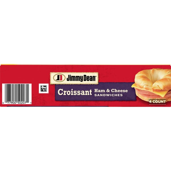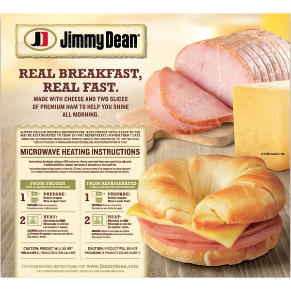 Rise and shine for a warm croissant sandwich. Savory sliced ham and melty cheese come together on a buttery croissant for a perfect start to your day. Packed with 11 grams of protein per serving, Jimmy Dean Frozen Ham and Cheese Croissant Sandwiches give you more fuel to power your morning. Simply microwave and serve for a delicious breakfast at home or on-the-go. Includes 4 individually wrapped sandwiches. Jimmy Dean once said, Sausage is a great deal like life. You get out of it what you put in.” Which pretty much sums up his magic formula for having a great day. Today, Jimmy Dean Brand brings you many ways to add some sunshine to your morning. Because today’s your day to shine on., Rise and Shine: Start your morning off with a boost of happiness so good, you can taste it. Our buttery croissant sandwiches are made with our savory sliced ham and melty cheese that will brighten anyone’s morning., The Perfect Family Breakfast: Made with real ingredients and packed with 11 grams of protein, our sandwiches help you and the family wake up on a positive note. So, gather around the table and enjoy a warm and hearty breakfast every morning., Never Miss Breakfast Again: Ready in just minutes, our breakfast sandwiches can conveniently be placed in the microwave and quickly heated. These hearty sandwiches make for the ideal meal., Enjoy Just the Way You Want: Relish the bold taste of our breakfast sandwiches on their own, or try your favorite hot sauce to add a kick of heat to your morning! Add a side of fruit or yogurt for a sweet bite too., Signature Sausage Since 1969: Since day one, we have worked hard to produce quality food that tastes as fresh as a country morning; because we know that for a lot of folks, a good start is all you need for a great day.