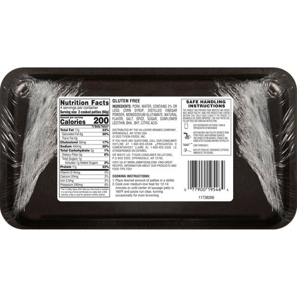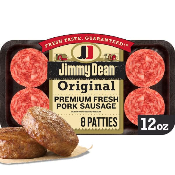 Enjoy a classic and easy breakfast made with fresh ingredients. Jimmy Dean Original Premium Fresh Pork Sausage Patties are perfectly seasoned with our signature blend of spices. Our pork sausage patties contain no artificial flavors or colors and are gluten-free. Easily prepare on the stovetop and serve with eggs and pancakes for a hearty breakfast. Add savory flavor to a casserole, breakfast burrito or omelet. Each serving of two patties contains 11 grams of protein. Every 12-ounce pack contains 4 servings. Keep frozen until ready to prepare. Ready when you are, our fresh pork sausage patties help your day in a savory way., One 8 count pack of Jimmy Dean Original Premium Fresh Pork Sausage Patties, Breakfast sausages are seasoned to perfection with our signature blend of spices, No artificial flavors or colors, Contains 11 grams of protein per serving, Gluten-free, Easy to cook sausage patties can be prepared on the stovetop, Ideal for serving with eggs and pancakes for a hearty breakfast