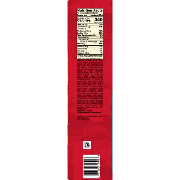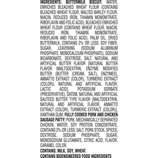 Buttermilk Biscuit: Water, Enriched Bleached Wheat Flour (contains Bleached Wheat Flour, Malted Barley Flour, Niacin, Reduced Iron, Thiamin Mononitrate Riboflavin And Folic Acid), Bleached Enriched Wheat Flour (contains Wheat Flour, Niacin, Reduced Iron Thiamin Mononitrate Riboflavin And Folic Acid), Palm Oil, Dried Buttermilk, Contains 2% Or Less: Soy Fiber Sugar. Leavening (sodium Aluminum Phosphate, Monocalcium Phosphate), Sodium Bicarbonate, Dextrose, Salt, Natural And Artificial Butter Flavor [natural Butter Flavor (maltodextrin, Enzyme Modified Butter [butter (cream, Salt), Enzymes], Annatto Extract (color), Turmeric Extract (color)], Natural And Artificial Flavor, Lactic Acid] Potassium Sorbate (preservative), Datem, Natural And Artificial Sauteed Butter Type Flavor [maltodextrin, Natural And Artificial Flavor, Annatto Extract (color), Turmeric Extract (color)], Xanthan Gum, Fully Cooked Pork And Chicken Sausage Patty: Pork, Mechanically Separated Chicken, Water, Soy Protein Concentrate, Contains 2% Or Less: Salt, Pork Stock, Spices Dextrose, Sodium Phosphate, Sugar. Monosodium Glutamate, Citric Acid, Flavor, Caramel Color. Extract (color), Turmeric Extract (color)], Xanthan Gum, Fully Cooked Pork And Chicken Sausage Patty: Pork, Mechanically Separated Chicken, Water, Soy Protein Concentrate, Contains 2% Or Less: Salt, Pork Stock, Spices Dextrose, Sodium Phosphate, Sugar. Monosodium Glutamate, Citric Acid, Flavor, Caramel Color.