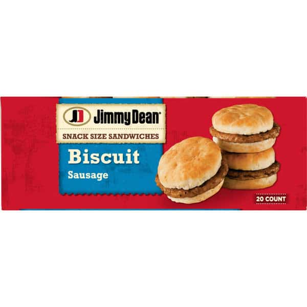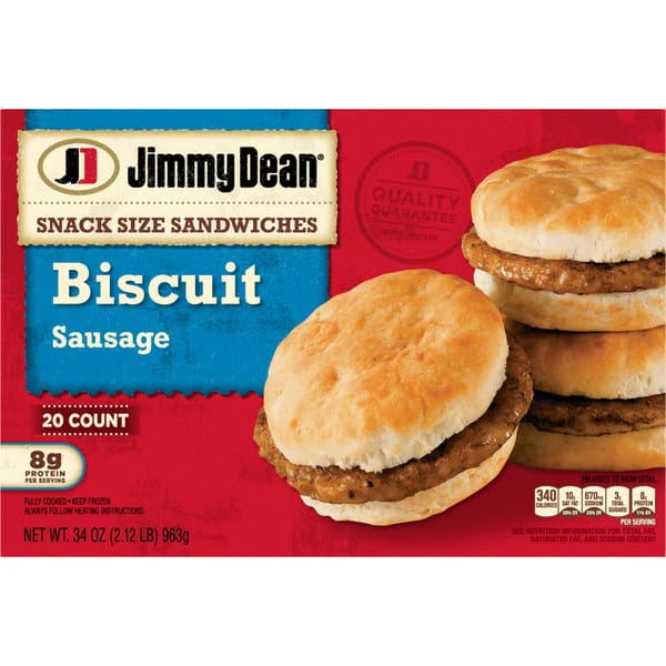 The best days start with sausage and biscuits. Featuring seasoned pork sausage patties on mini golden baked biscuits, Jimmy Dean Frozen Snack Size Sausage Biscuit Sandwiches are delicious to the last bite. With 8 grams of protein per serving, these tasty little sandwiches are perfect for breakfast or snacking. Simply microwave and serve for a warm biscuit sandwich at home or on-the-go. Includes 20 biscuit sandwiches. Jimmy Dean once said, Sausage is a great deal like life. You get out of it what you put in.” Which pretty much sums up his magic formula for having a great day. Today, Jimmy Dean Brand brings you many ways to add some sunshine to your morning. Because today’s your day to shine on., Rise and Shine: Start your morning off with a boost of happiness so good, you can taste it. Our snack size, golden biscuit sandwiches are made with our signature savory sausage that will brighten anyone’s morning., The Perfect Family Breakfast: Made with real ingredients and packed with 8 grams of protein, our sandwiches help you and the family wake up on a positive note. So, gather around the table and enjoy a warm and hearty breakfast every morning., Never Miss Breakfast Again: Ready in just minutes, our breakfast sandwiches can conveniently be placed in the microwave and quickly heated. These hearty sandwiches make for the ideal meal., Enjoy Just the Way You Want: Relish the bold taste of our breakfast sandwiches on their own, or try your favorite hot sauce to add a kick of heat to your morning! Add a side of fruit or yogurt for a sweet bite too., Signature Sausage Since 1969: Since day one, we have worked hard to produce quality food that tastes as fresh as a country morning; because we know that for a lot of folks, a good start is all you need for a great day.