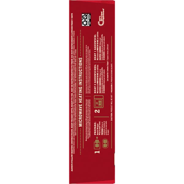 Microwave: ALWAYS FOLLOW HEATING INSTRUCTIONS. KEEP FROZEN UNTIL READY TO USE. MAY BE REFRIGERATED TO THAW. DO NOT REFRIGERATE LONGER THAN 7 DAYS. Microwave OvenDirections were developed using an 1100-watt microwave oven. Ovens vary; heat times may need to be adjusted. Microwave times are approximate. If additional time is needed, microwave 5 seconds at a time until hot. 1. PREPARE:Remove wrapper. Wrap in paper towel. 2. HEAT 2 SANDWICHES:Microwave on HIGH 50-55 SECONDS or until hot. HEAT 1 SANDWICH:Microwave on HIGH 30-35 SECONDS or until hot. Let stand for 1 minute. Enjoy!CAUTION: PRODUCT WILL BE HOT
