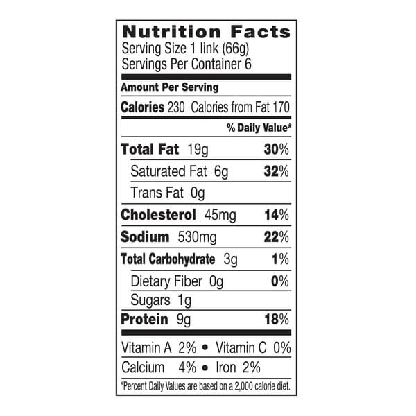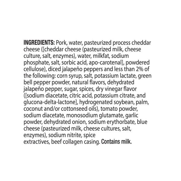 Pork, Water, Pasteurized Process Cheddar Cheese ([cheddar Cheese (pasteurized Milk, Cheese Culture, Salt, Enzymes), Water, Milkfat, Sodium Phosphate, Salt, Sorbic Acid, Apo-carotenal], Powdered Cellulose), Diced Jalapeno Peppers And Less Than 2% Of The Following: Corn Syrup, Salt, Potassium Lactate, Green Bell Pepper Powder, Natural Flavors, Dehydrated Jalapeno Pepper, Sugar, Spices, Dry Vinegar Flavor ([sodium Diacetate, Citric Acid, Potassium Citrate, And Glucona-delta-lactone], Hydrogenated Soybean, Palm, Coconut And/or Cottonseed Oils), Tomato Powder, Sodium Diacetate, Monosodium Glutamate, Garlic Powder, Dehydrated Onion, Sodium Erythorbate, Blue Cheese (pasteurized Milk, Cheese Cultures, Salt, Enzymes), Sodium Nitrite, Spice Extractives, Beef Collagen Casing.