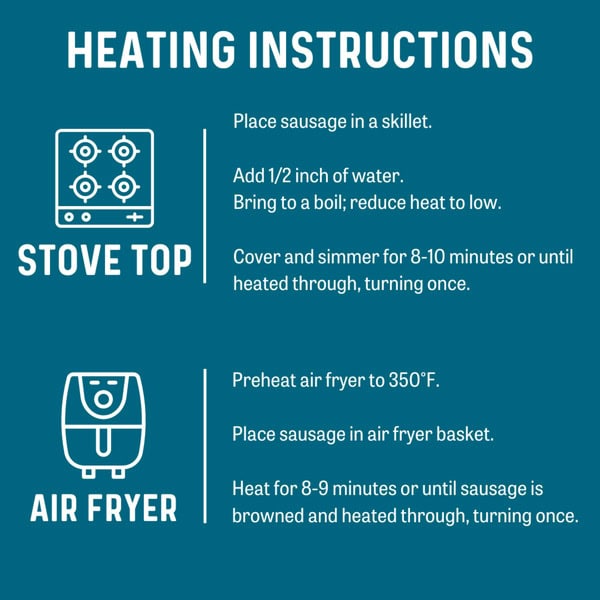 Stovetop Simmer: Bring ½ inch water to a boil in a pan. Add links; cover and simmer for 6-8 minutes or until heated through, turning once.