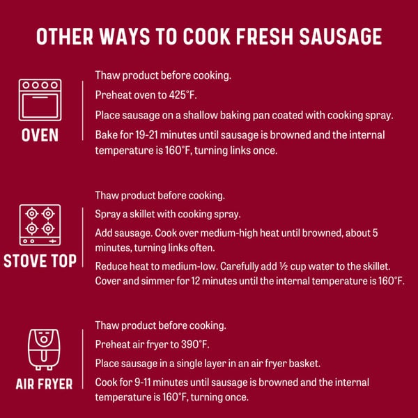 Grilling: Thaw product prior to cooking. Preheat grill to medium-low. Add sausage. Cook, covered, for 15-20 minutes until sausage is browned and the internal temperature is 160°F, turning links often.