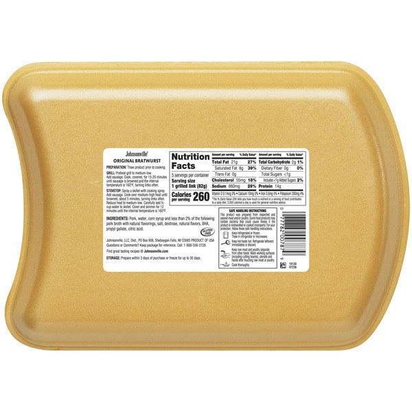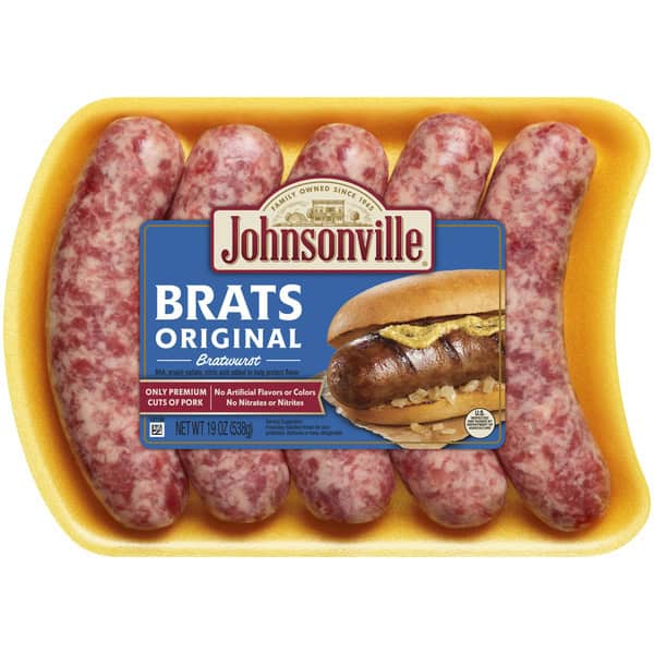 •Upgrade your next barbecue, picnic, or family gathering with Johnsonville Original Brats! This original family recipe is made with only premium cuts of pork and seasoned with a unique blend of herbs and spices delivering a juicy, robust flavor. Our Original Brats have all the flavor you crave without any artificial colors or flavors, nitrates, or nitrites. Perfect for summer cookouts, Johnsonville Original Brats easy to grill and taste great in a variety of recipes as well!