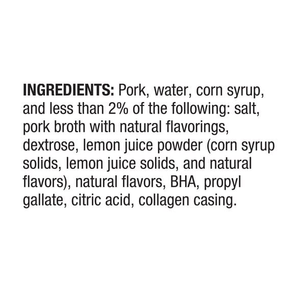 Pork, Water, Corn Syrup, And Less Than 2% Of The Following: Salt, Pork Broth With Natural Flavorings, Dextrose, Lemon Juice Powder (corn Syrup Solids, Lemon Juice Solids, And Natural Flavors), Natural Flavors, Bha, Propyl Gallate, Citric Acid, Beef Collagen Casing.