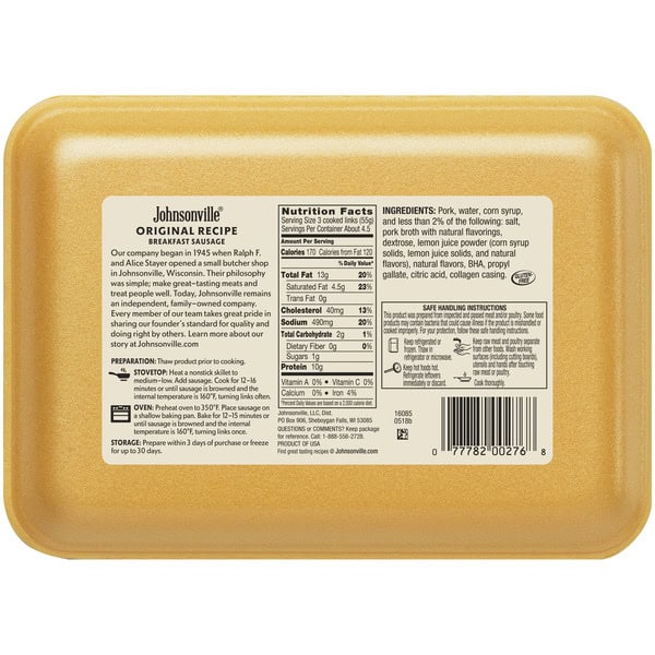 Start your day with flavor with Johnsonville Original Breakfast Sausage! Made with only premium cuts of pork and uniquely blended with seasoning, these delicious sausages never contain any artificial colors or flavors. Perfect for breakfasts before school or work, Johnsonville Original Breakfast Sausages are a quick, easy choice the whole family will love.
