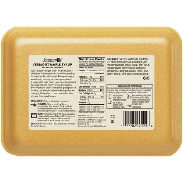 Johnsonville Vermont Maple Syrup Breakfast Sausage Links blend real Vermont maple syrup with premium cuts of pork for a subtle, sweet, and flavorful breakfast choice. Made with quality ingredients, these delicious breakfast sausage links never contain any artificial colors or flavors. Perfect for breakfasts before school or work, Vermont Maple Syrup Breakfast Links are easy and quick to make. Plus the whole family will love them!