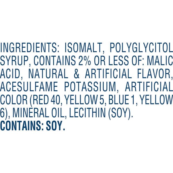 Isomalt, Polyglycitol Syrup, Contains 2% Or Less Of: Malic Acid, Natural & Artificial Flavor Acesulfame Potassium, Artificial Color (red 40, Yellow 5, Blue 1, Yellow 6), Mineral Oil, Lecithin (soy)