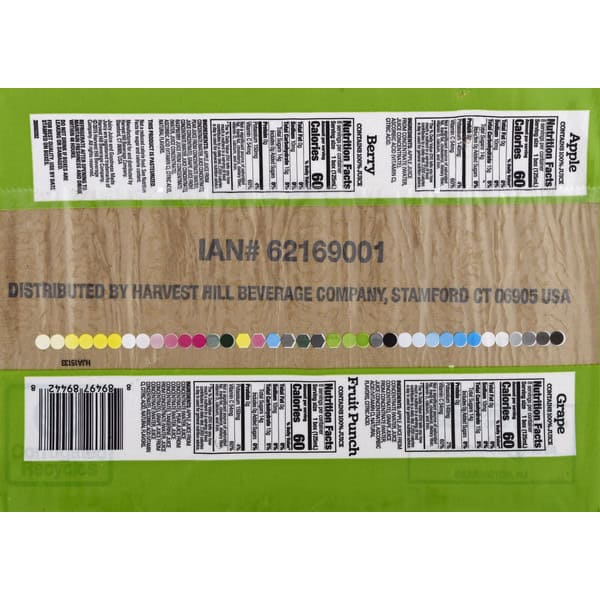 Apple: Apple Juice from Concentrate (Water, Juice Concentrate), Ascorbic Acid (Vitamin C), Citric Acid, Grape: Apple Juice from Concentrate (Water, Juice Concentrate), Grape Juice from Concentrate (Water, Juice Concentrate), Ascorbic Acid (Vitamin C), Natural Flavors, Citric Acid, Berry: Apple Juice from Concentrate (Water, Juice Concentrate), Pear Juice from Concentrate (Water, Juice Concentrate), Grape Juice from Concentrate (Water, Juice Concentrate), Raspberry Juice from Concentrate (Water, Juice Concentrate), Ascorbic Acid (Vitamin C), Citric Acid, Natural Flavors, Fruit Punch: Apple Juice from Concentrate (Water, Juice Concentrate), Pear Juice from Concentrate (Water, Juice Concentrate), Tangerine Juice from Concentrate (Water, Juice Concentrate), Grape Juice from Concentrate (Water, Juice Concentrate), Ascorbic Acid (Vitamin C), Citric Acid, Natural Flavors.