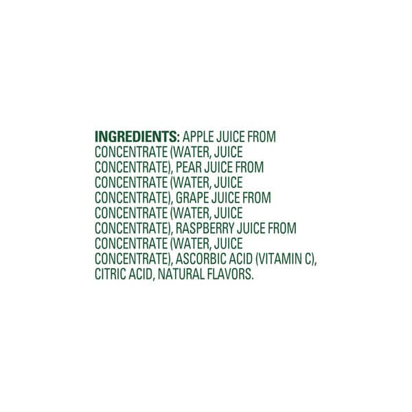 Apple Juice From Concentrate (water, Juice Concentrate), Pear Juice From Concentrate (water, Juice Concentrate), Grape Juice From Concentrate (water, Juice Concentrate), Raspberry Juice From Concentrate (water, Juice Concentrate), Ascorbic Acid (vitamin C), Citric Acid, Natural Flavors.