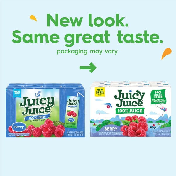 Enjoy the taste of 100% fruit juice with Juicy Juice Berry Juice. The sweetness in this no sugar added juice comes straight from fruit for a delicious berry flavor kids love. With no added sugar, no high fructose corn syrup and no artificial sweeteners, this 100% juice blend is an excellent choice for the whole family. Juicy Juice makes parents and kids happy by providing 3/4 cup of fruit and 100% of the daily value of Vitamin C per juice box. Pack this juice drink in a lunch box or enjoy the berry juice box for an on the go drink. This eight count pack of 6.75 fl oz Juicy Juice Berry Juice Boxes is perfect for busy families. Try Juicy Juice Berry Juice in a recloseable bottle, perfect for having ready to drink kids juice on hand. With a variety of kids juices, Juicy Juice is the choice that parents can feel good about! Juicy Juice is goodness made juicy.
