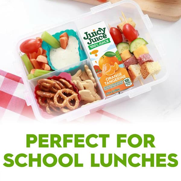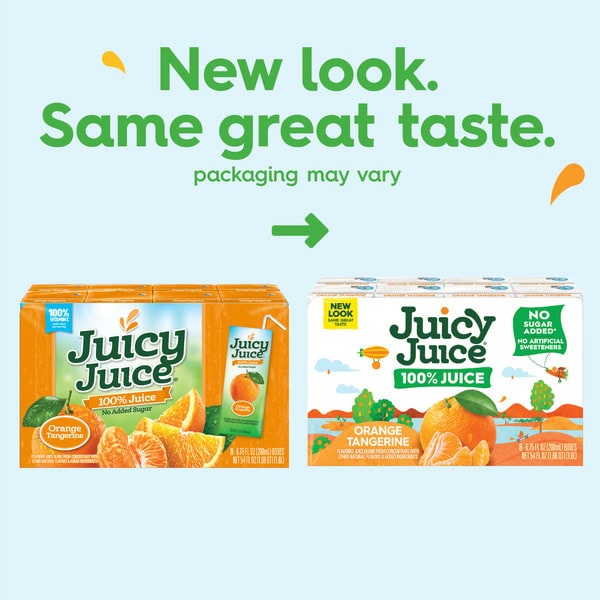 Enjoy the taste of 100% fruit juice with Juicy Juice Orange Tangerine Juice. The sweetness in this no sugar added juice comes straight from fruit for a delicious orange tangerine flavor kids love. With no added sugar, no high fructose corn syrup and no artificial sweeteners, this 100% juice blend is an excellent choice for the whole family. Juicy Juice makes parents and kids happy by providing 3/4 cup of fruit and 100% of the daily value of Vitamin C per orange juice box. Pack this juice drink in a lunch box or enjoy the orange tangerine juice box for an on the go drink. This eight count pack of 6.75 fl oz Juicy Juice Orange Tangerine Juice Boxes are perfect for busy families. Try Juicy Juice Orange Tangerine Juice in a reclosable bottle, perfect for having ready to drink kids juice on hand. With a variety of kids juices, Juicy Juice is the choice that parents can feel good about! Juicy Juice is goodness made juicy.