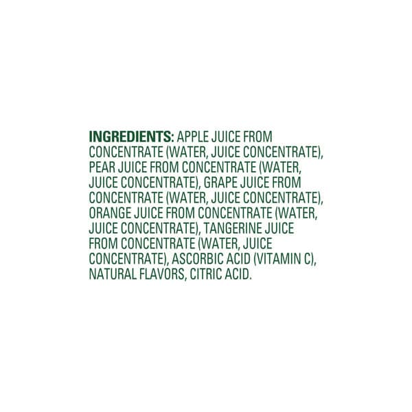 Apple Juice From Concentrate (water, Juice Concentrate), Pear Juice From Concentrate (water, Juice Concentrate), Grape Juice From Concentrate (water, Juice Concentrate), Orange Juice From Concentrate (water, Juice Concentrate), Tangerine Juice From Concentrate (water, Juice Concentrate). Ascorbic Acid (vitamin C), Natural Flavors, Citric Acid.